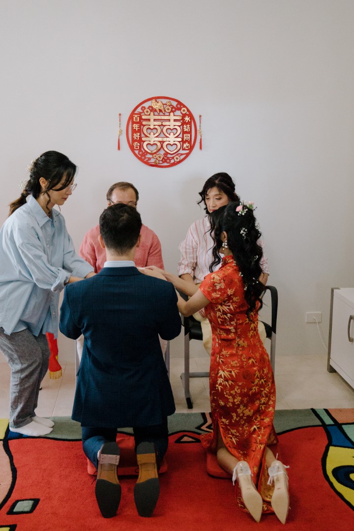 A bride and groom at their chinese tea ceremony on the day of their sustainable wedding